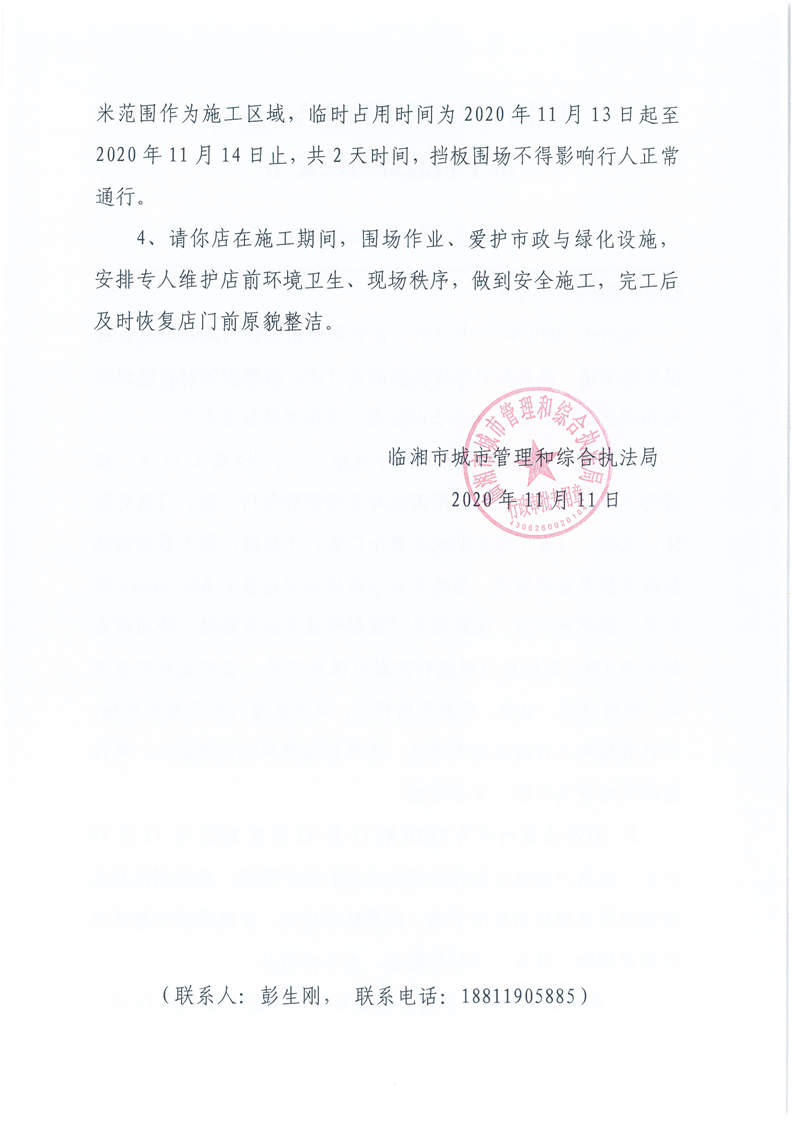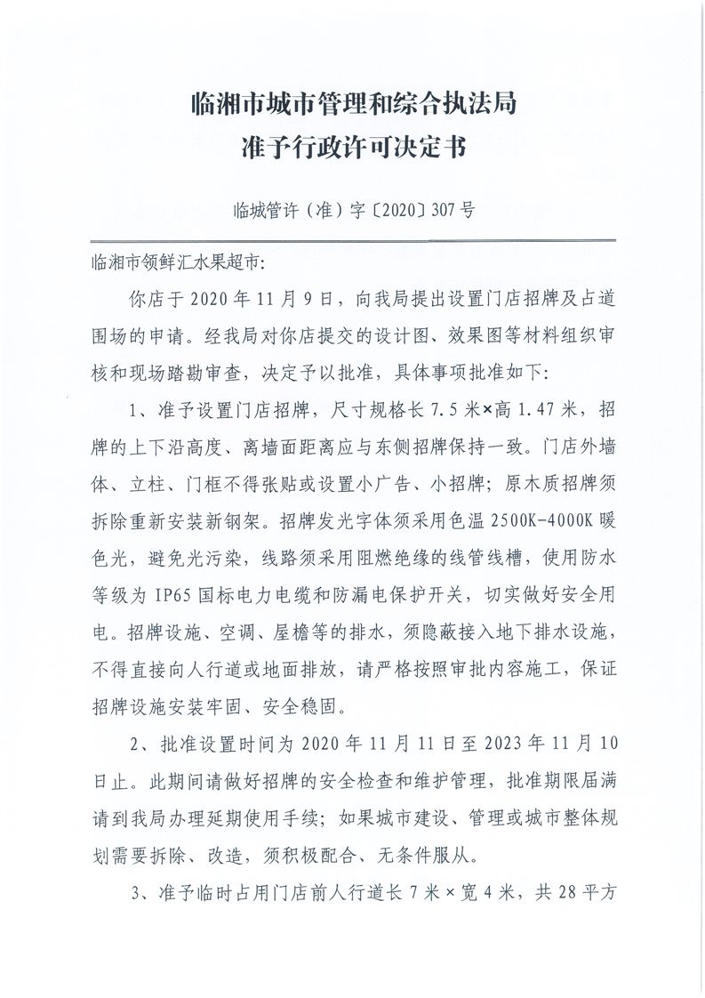 临湘市领鲜汇水果超市办理门店招牌设置、临时占用城市道路许可