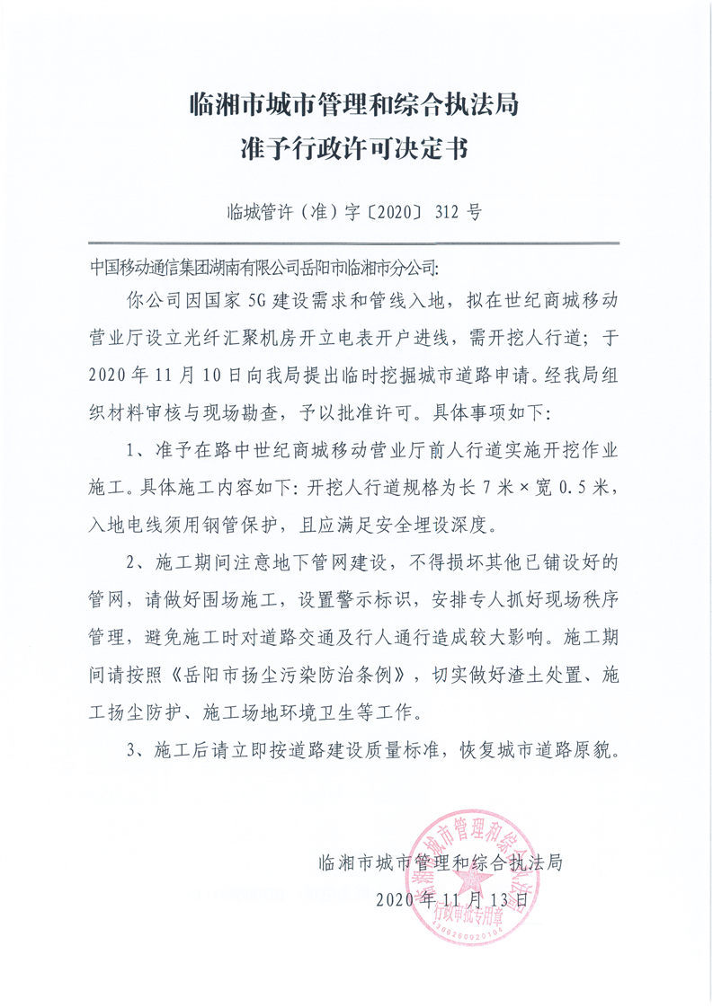 中国移动通信集团湖南有限公司岳阳市临湘市分公司办理临时挖掘城市道路许可
