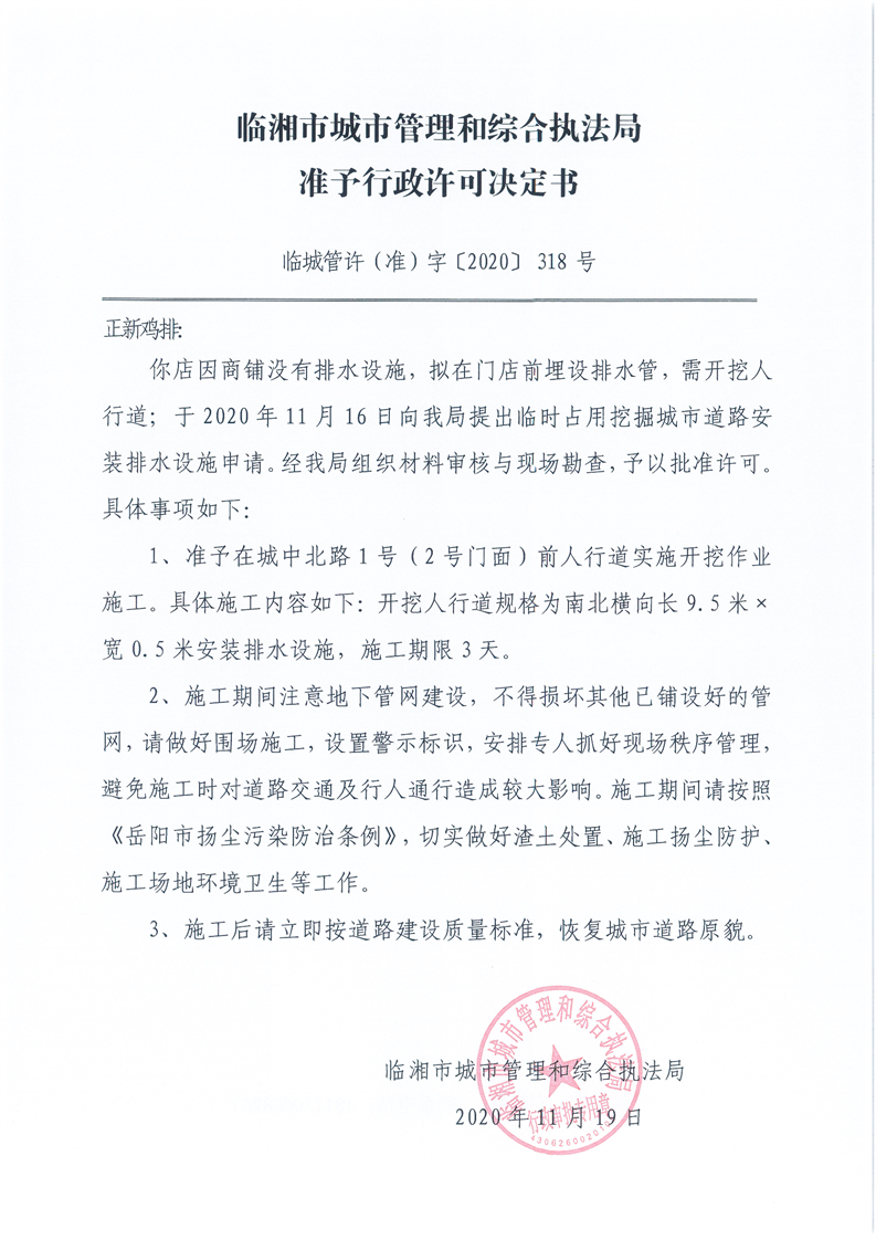 正新鸡排(原如意商场2号门面)办理临时挖掘城市道路许可