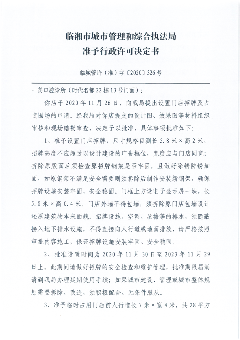一美口腔诊所办理门店招牌设置、临时占用城市道路许可