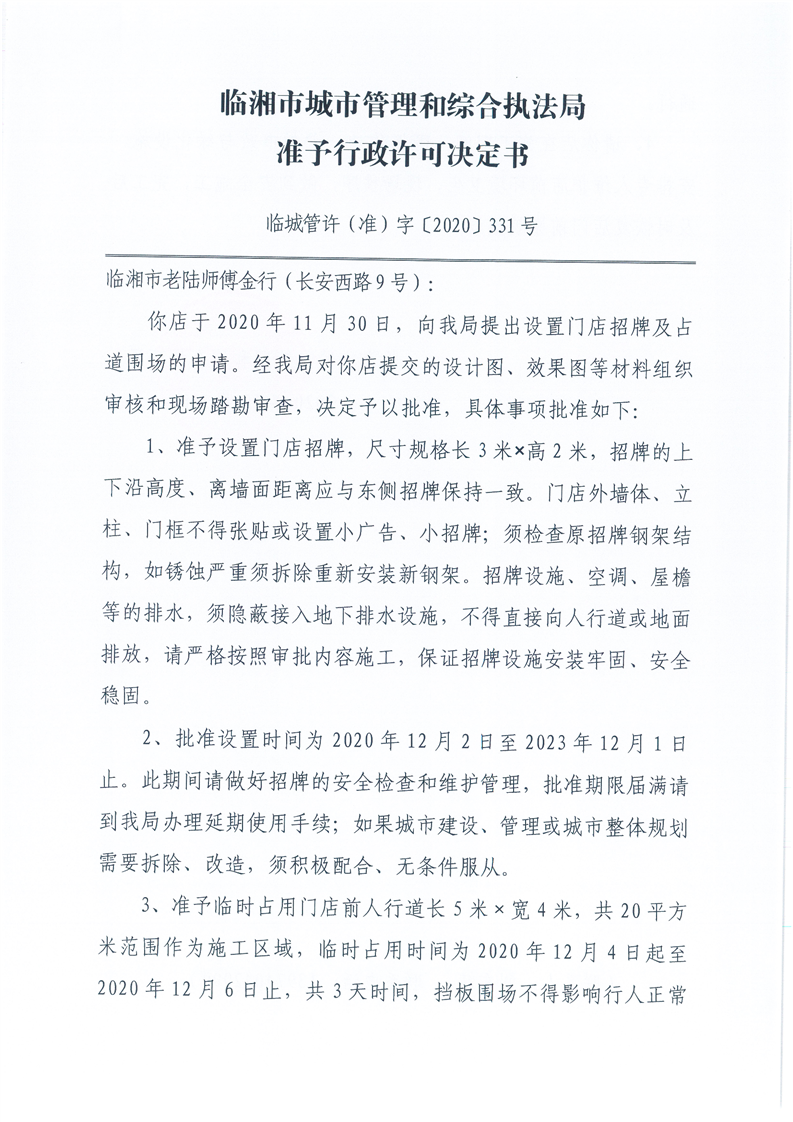 临湘市老陆师傅金行办理门店招牌设置、临时占用城市道路许可