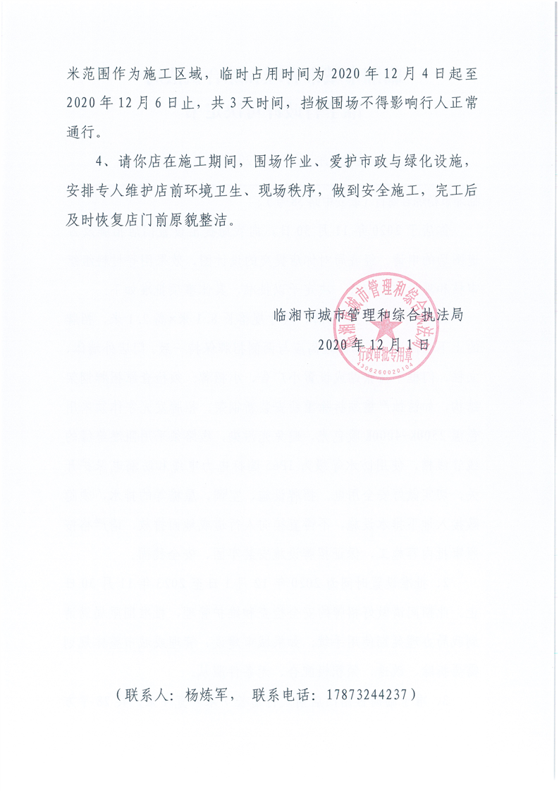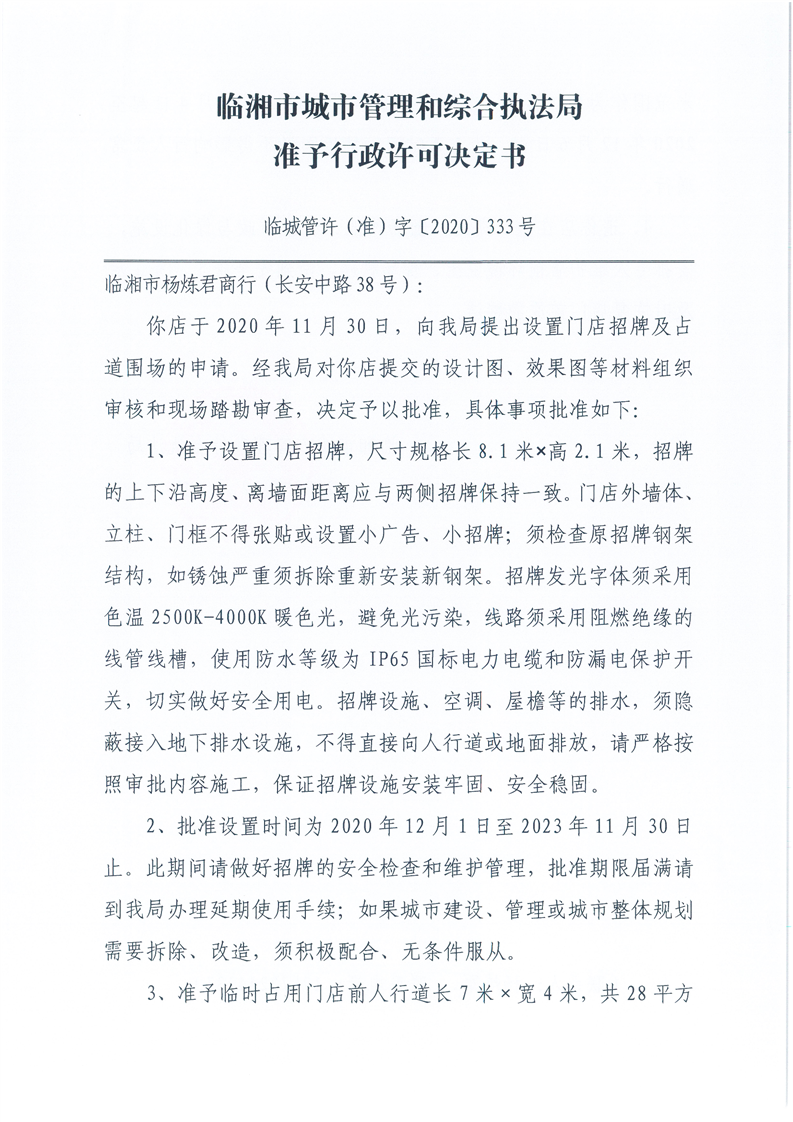 临湘市杨炼君商行办理门店招牌设置、临时占用城市道路许可