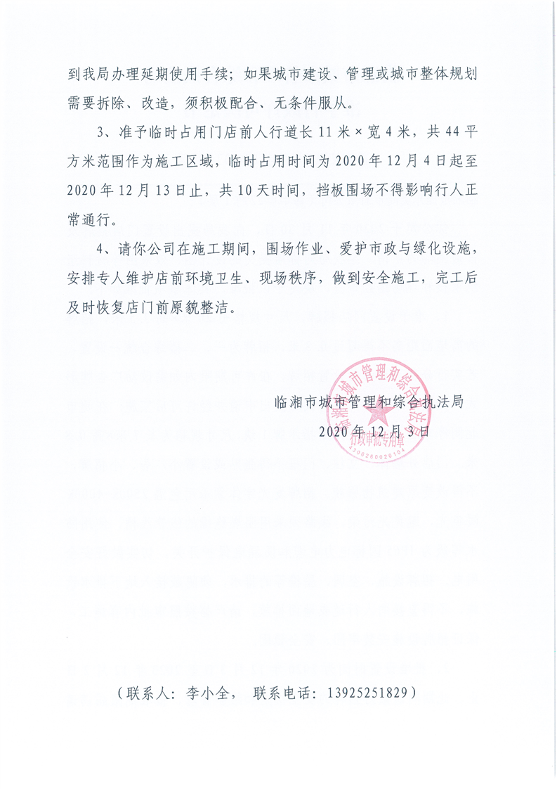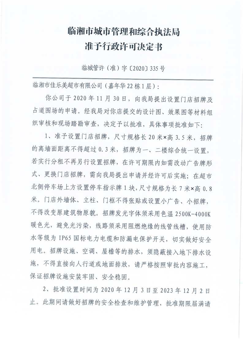 临湘市佳乐美超市有限公司办理门店招牌设置、临时占用城市道路许可