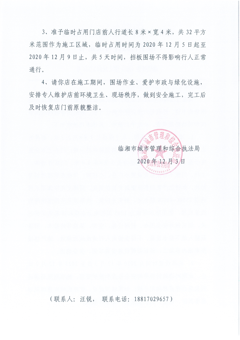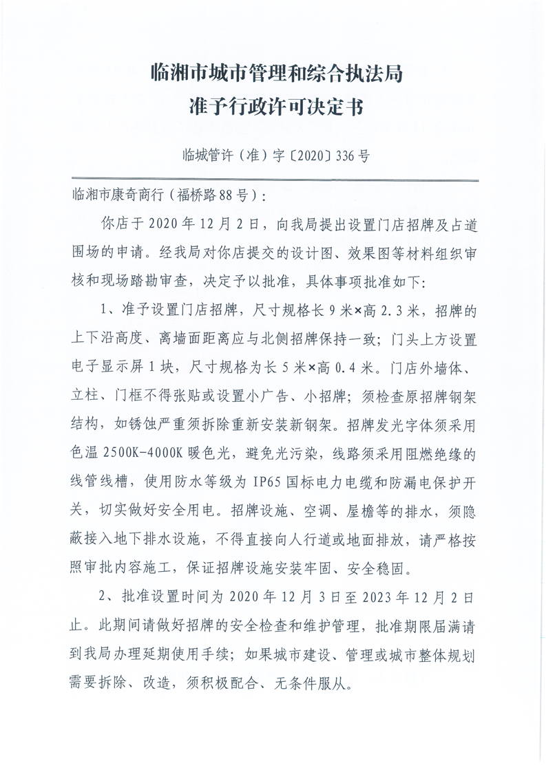 临湘市康奇商行办理门店招牌设置、临时占用城市道路许可