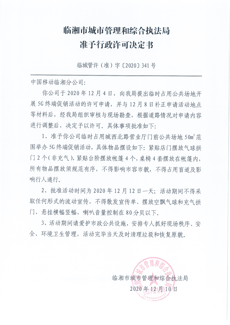 中国移动临湘分公司 办理临时占用街道两侧和公共场地许可
