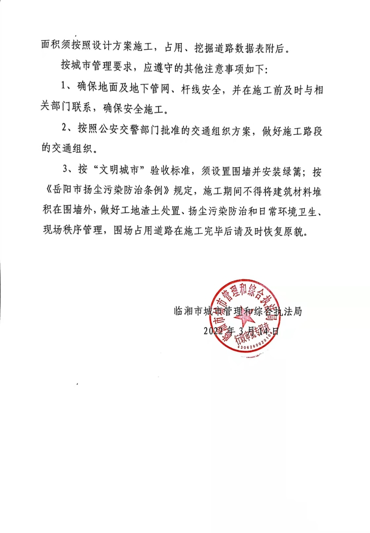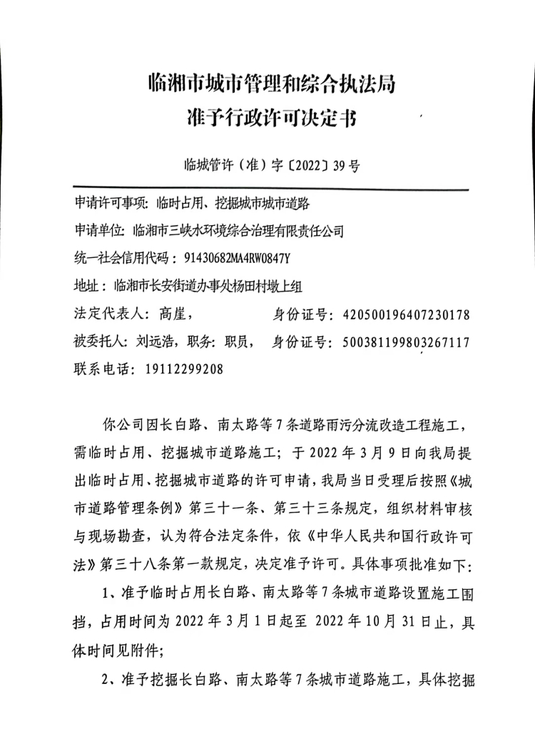 临湘市三峡水环境综合治理有限责任公司办理临时占用、挖掘城市道路许可