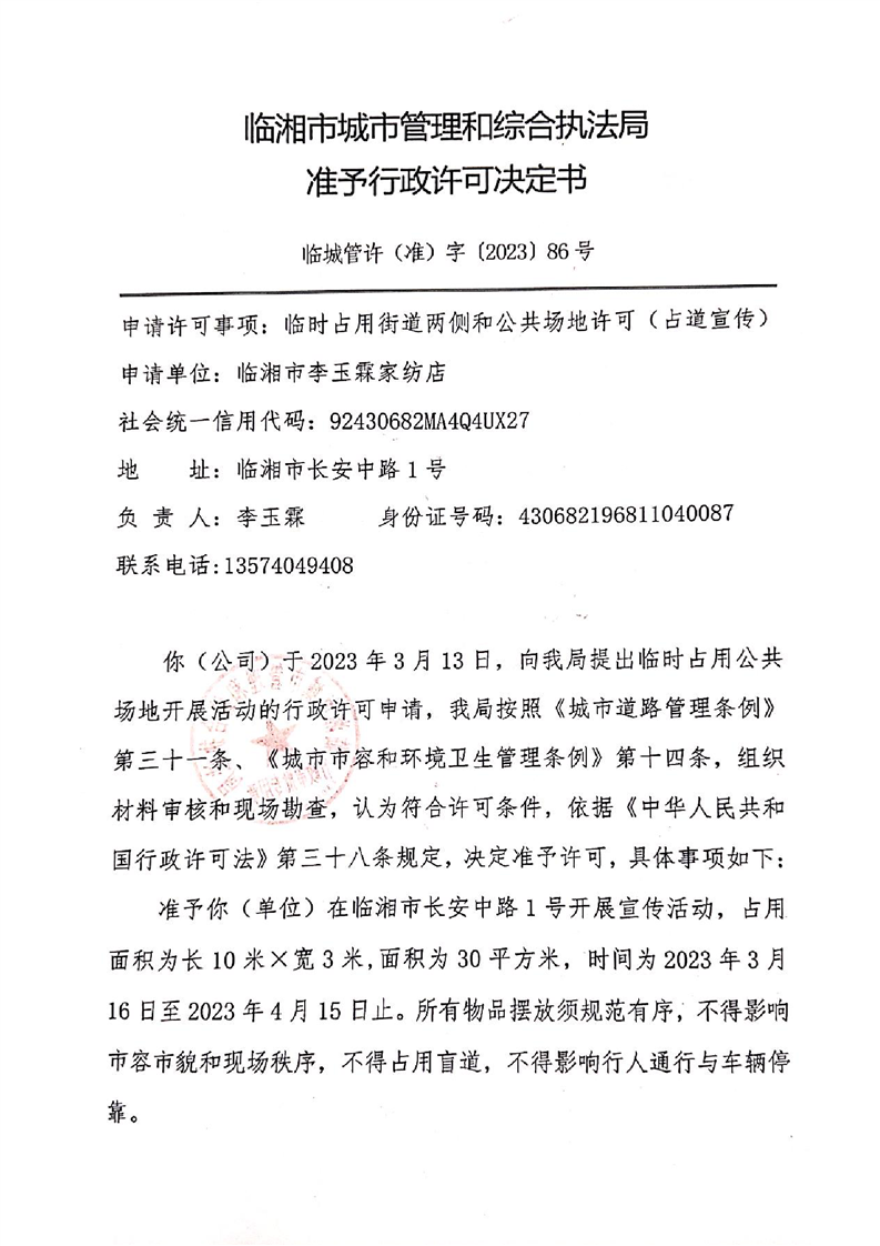临湘市李玉霖家纺店办理临时占用街道两侧和公共场地许可(占道宣传)