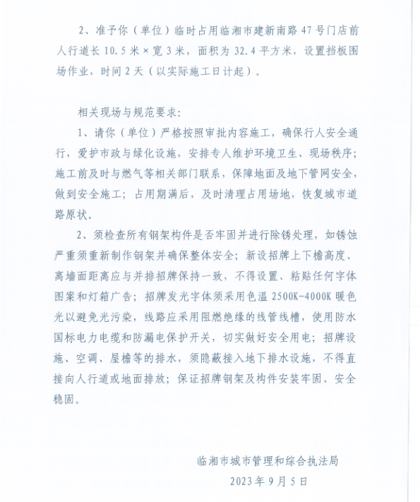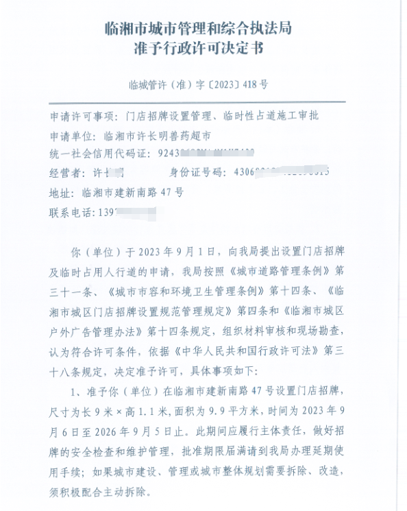 临湘市许长明兽药超市办理门店招牌设置管理、临时性占道施工许可