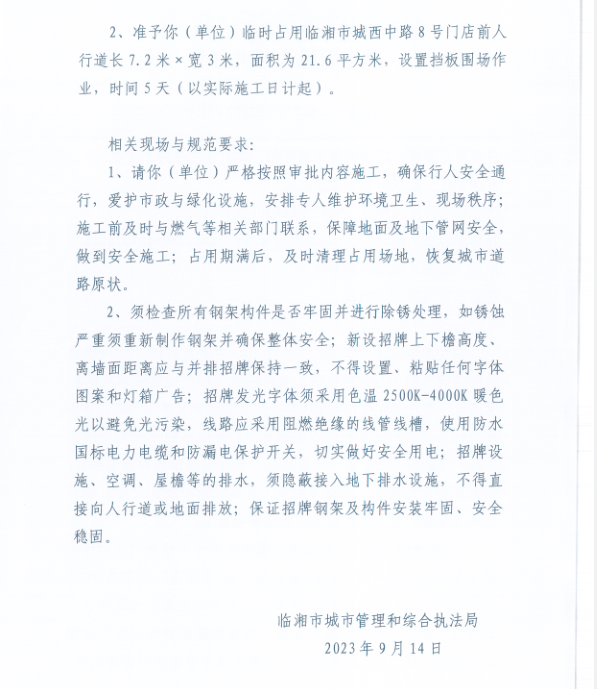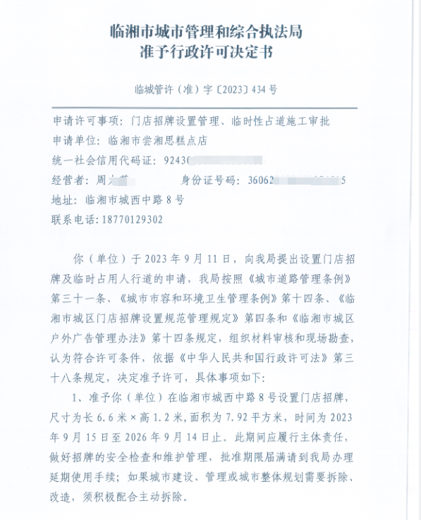 临湘市尝湘思糕点店办理门店招牌设置管理、临时性占道施工许可