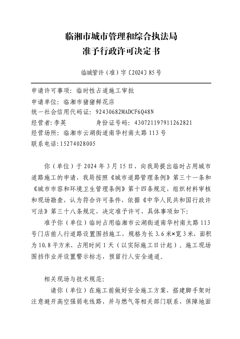 临湘市猪猪鲜花店办理门店招牌设置备案临、时占用城市道路许可