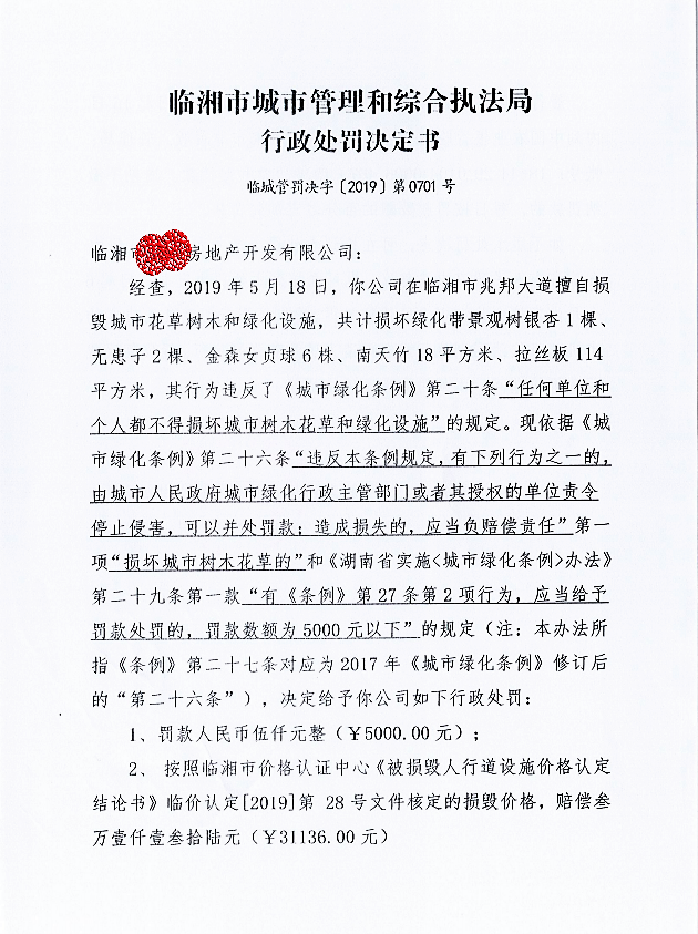 对临湘市**房地产有限公司擅自损毁城市花草树木和绿化设施的处罚