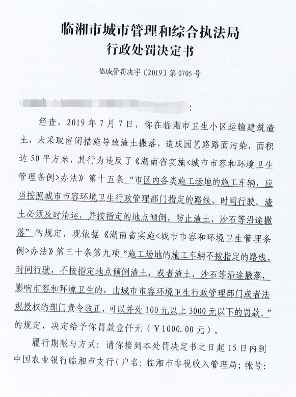 对何某因运输渣土沿途撒落污染城市道路的处罚