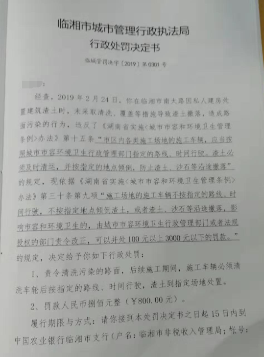 对付某因运输渣土沿途撒落污染城市道路的处罚