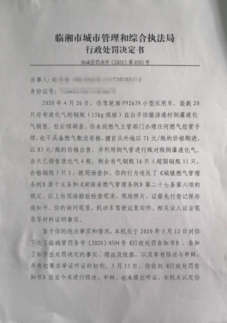 对刘某违法违规无证经营液化气、倒灌液化气行为的行政处罚