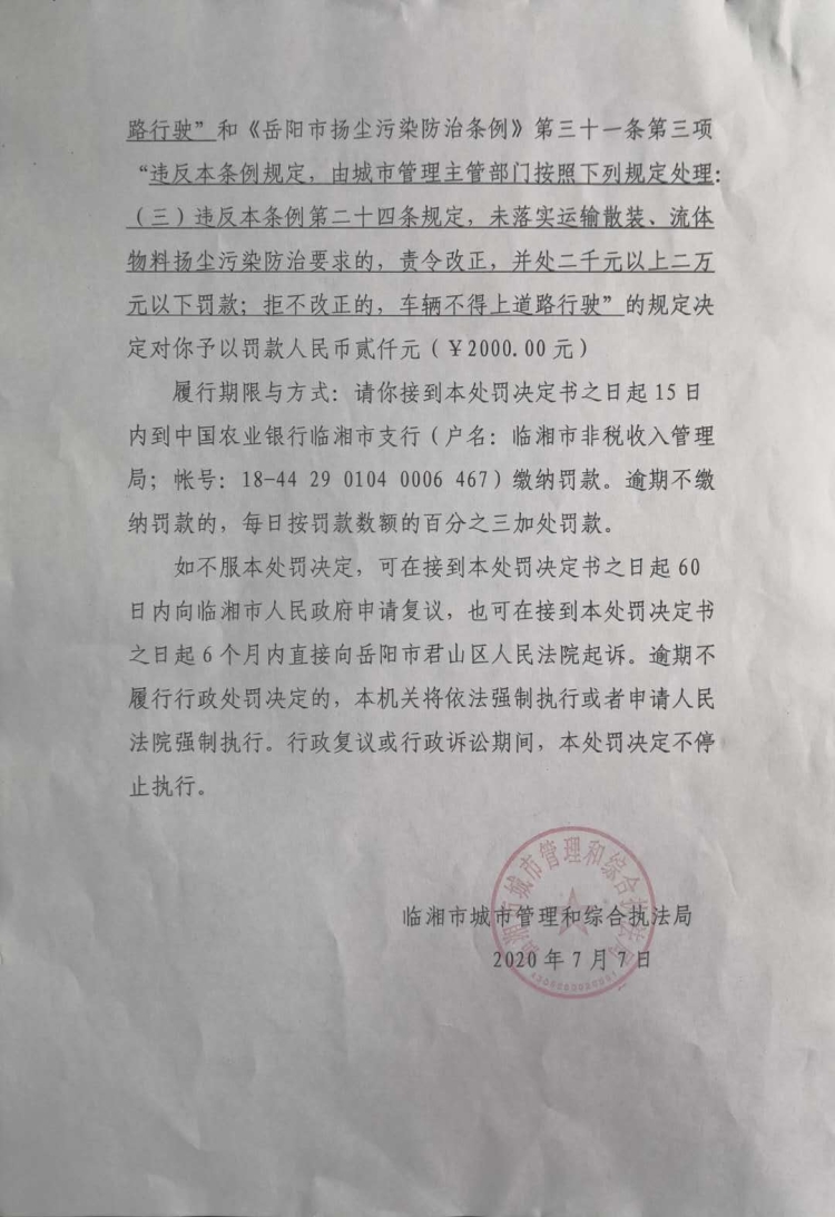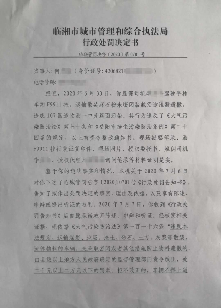 对何某未密闭运输散装流体物料污染环境的行政处罚