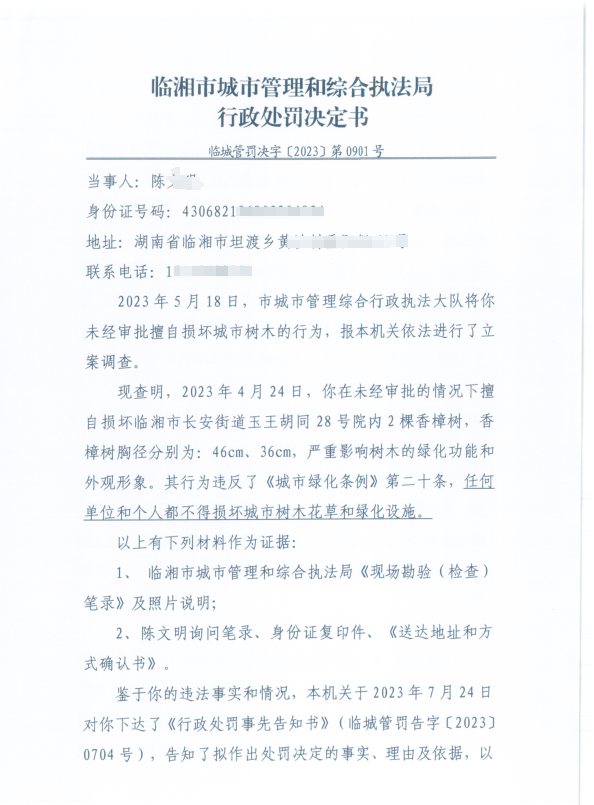 对陈某未经批准擅自损坏城市树木的行政处罚