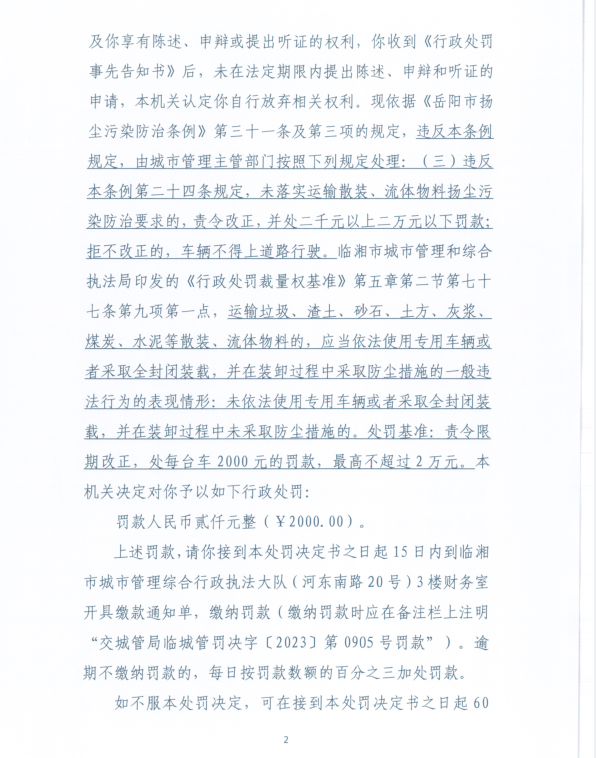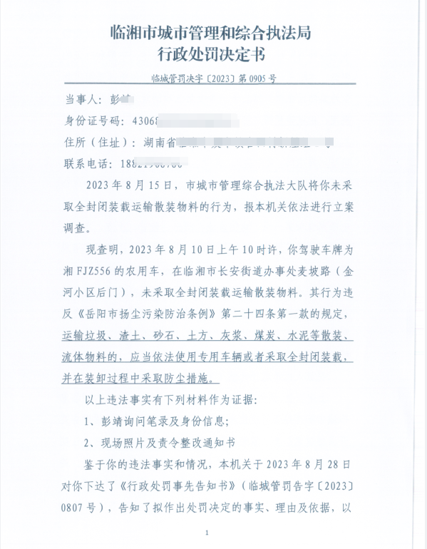 对彭某未采取全封闭装载运输散装物料的行政处罚