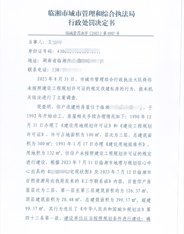 对王某未按照建设工程规划许可证的规定扩建私房的行政处罚