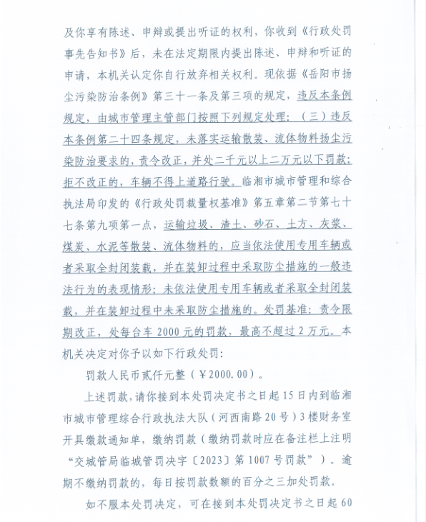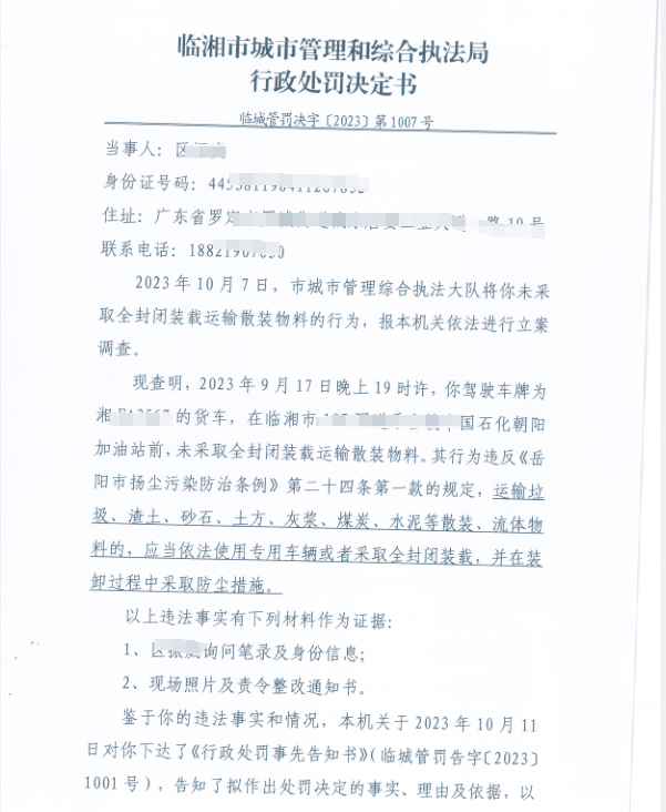 对区某未采取全封闭装载运输散装物料的行政处罚