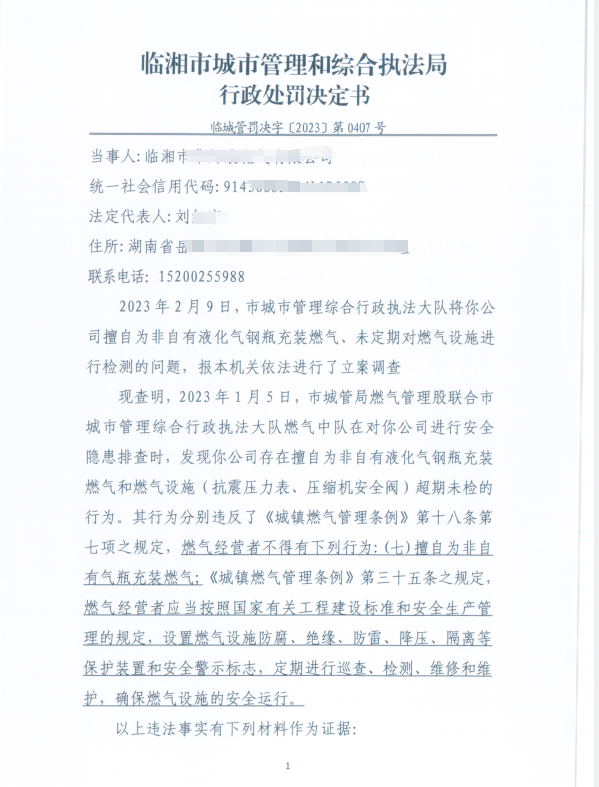 对某公司擅自为非自有液化气钢瓶充装燃气、未定期对燃气设施进行检测的行政处罚