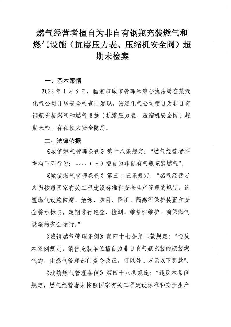 典型案例(燃气经营者擅自为非自有钢瓶充装燃气和燃气设施(抗震压力表、压缩机安全阀)超期未检案)