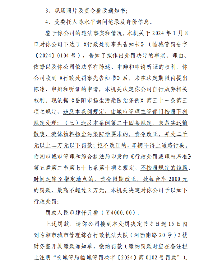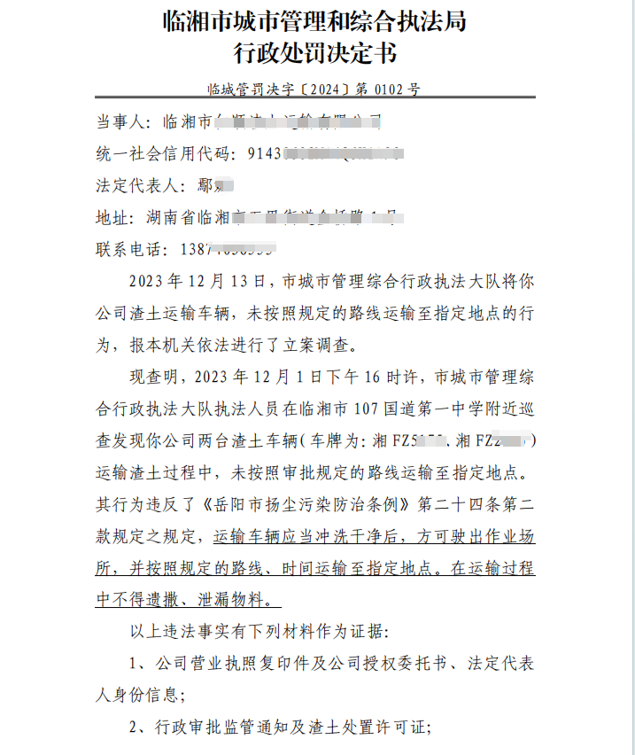 对某公司未按审批规定的线路运输渣土的行政处罚