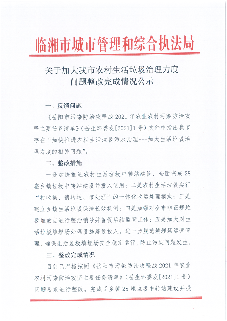 关于加大我市农村生活垃圾治理力度问题整改完成情况公示