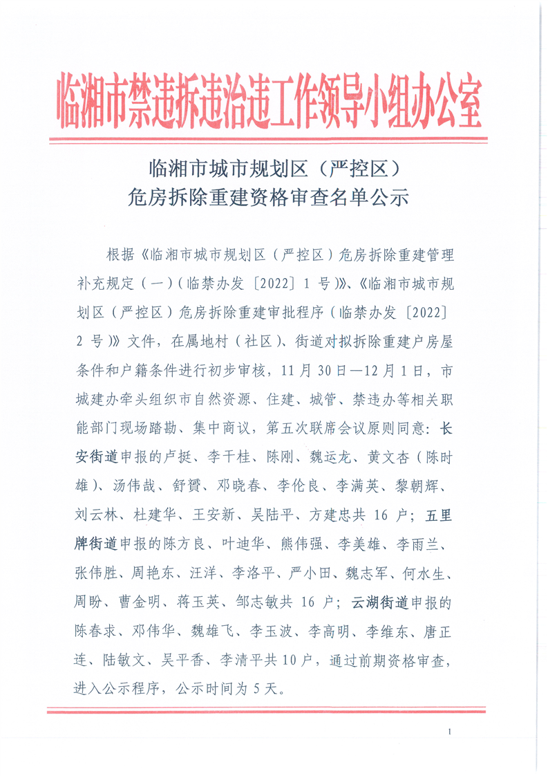临湘市城市规划区(严控区)危房拆除重建资格审查名单