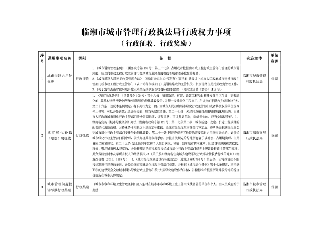 临湘市城市管理行政执法局行政权力事项—行政征收、行政奖励
