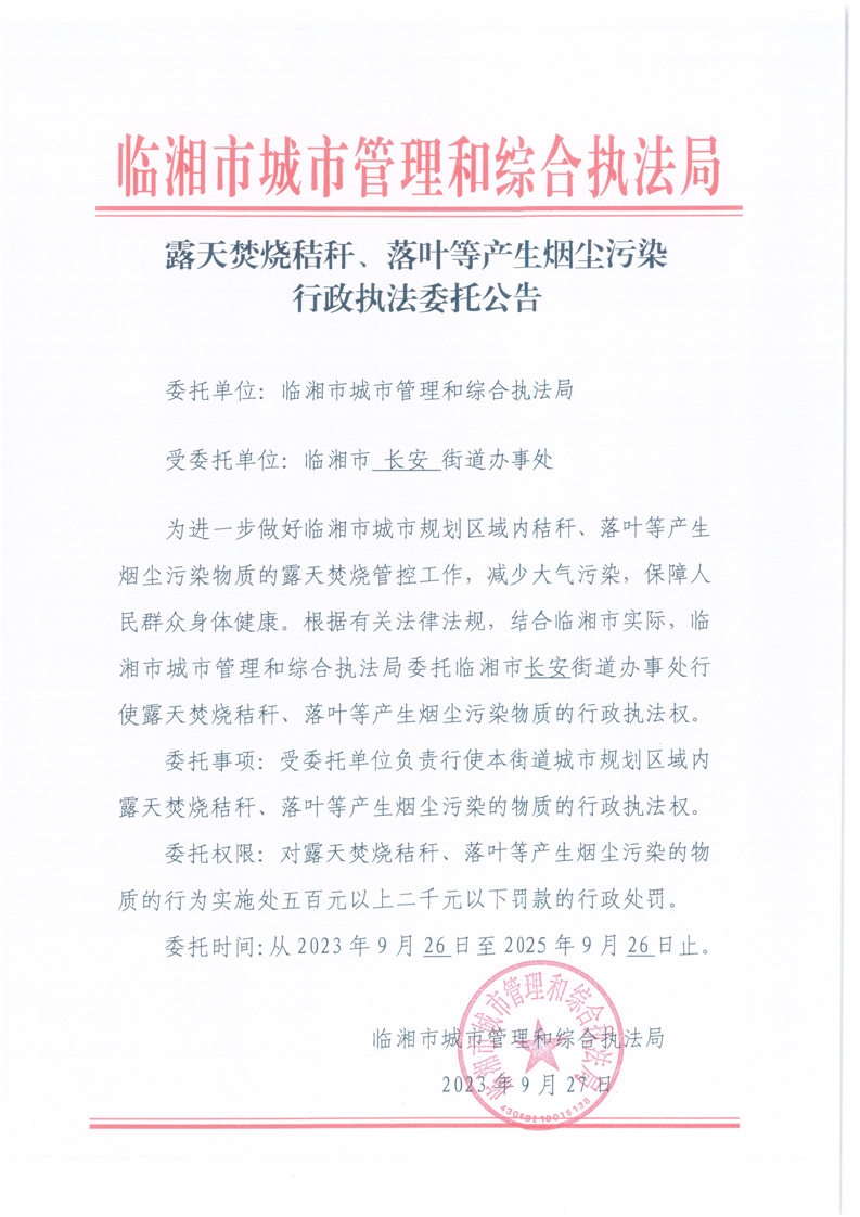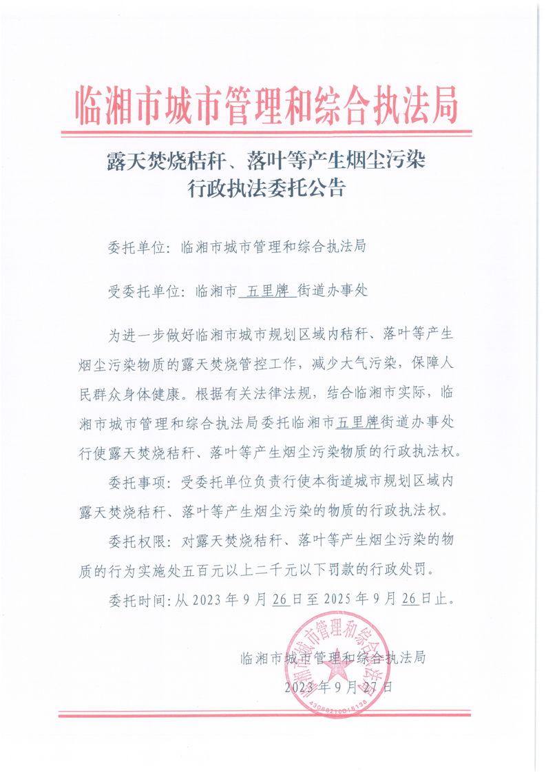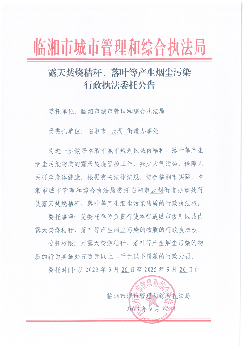 露天焚烧秸秆、落叶等产生烟尘污染行政执法委托公告