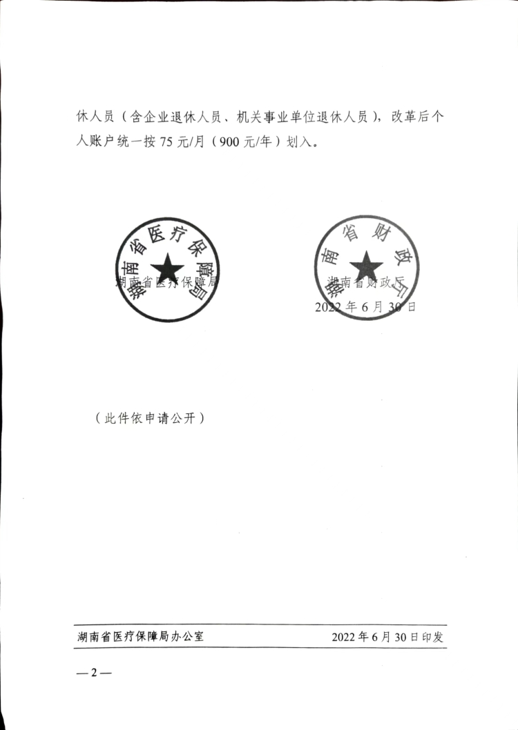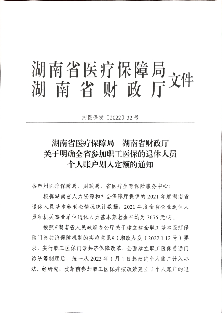 湖南省医疗保障局 湖南省财政厅 关于明确全省参加职工医保的退休人员个人账户划入定额的通知 湘医保发〔2022〕32号
