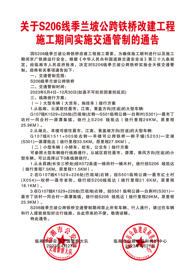 关于S206线季兰坡公跨铁桥改建工程施工期间实施交通管制的通告