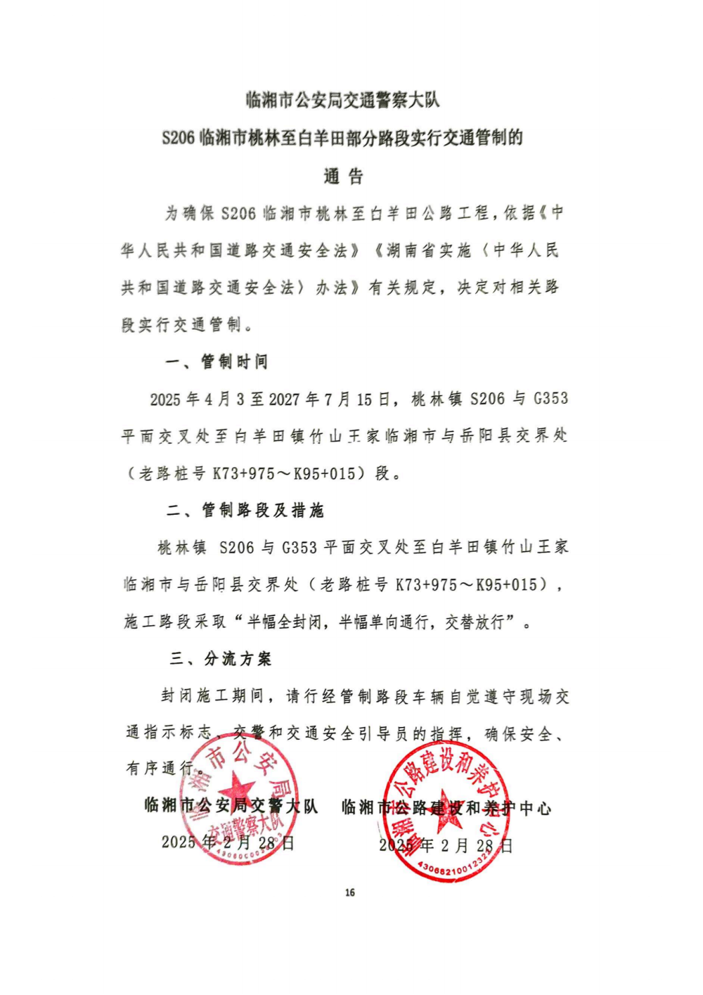 S206临湘市桃林至白羊田部分路段实行交通管制的公告
