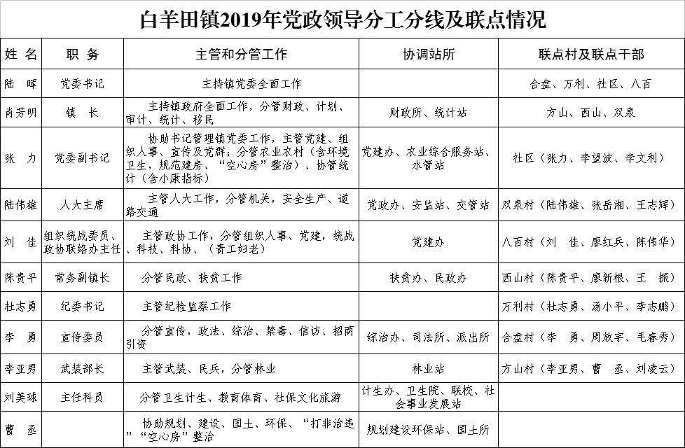 白羊田镇2019年党政领导分工分线及联点情况