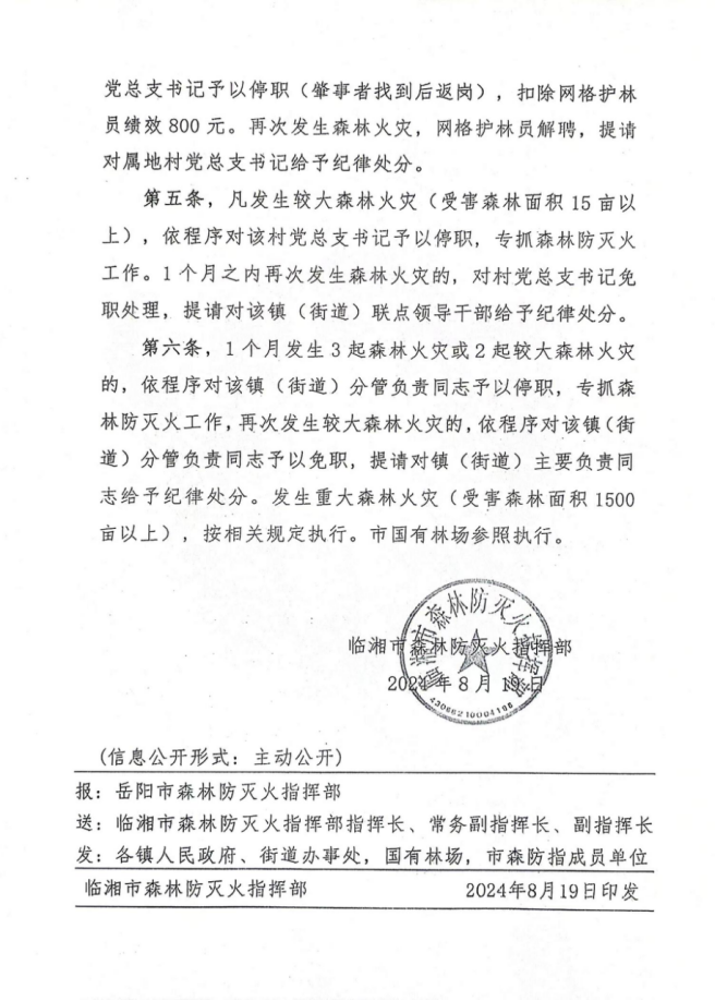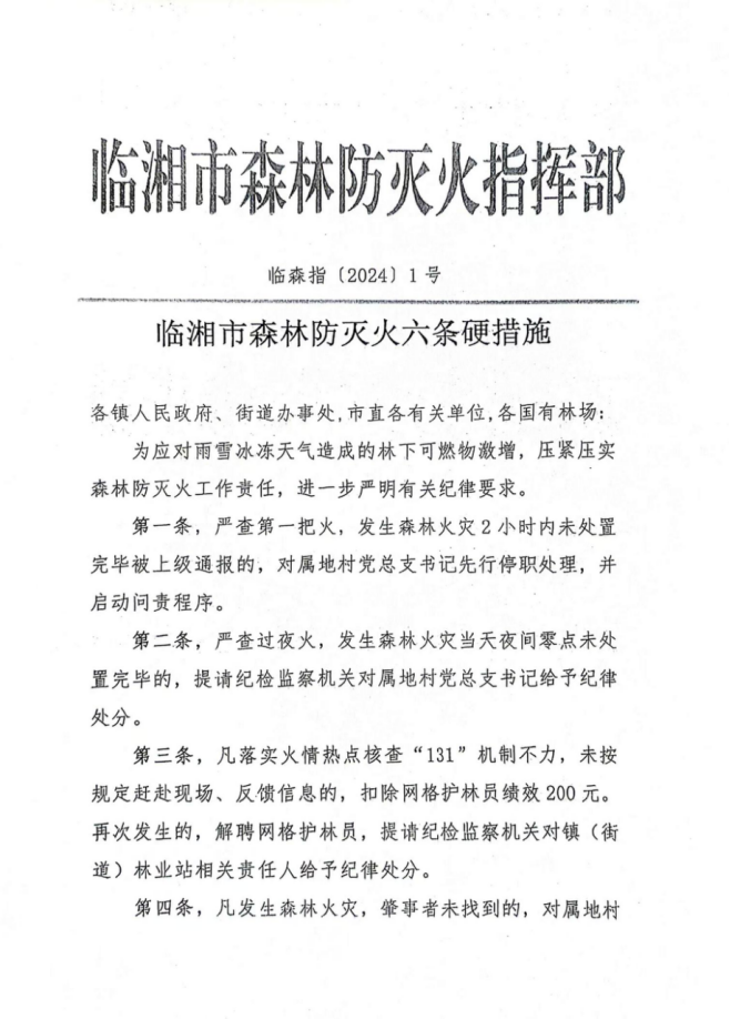 关于转发《临湘市森林防灭火指挥部关于临湘市森林防灭火六条硬措施》的通知