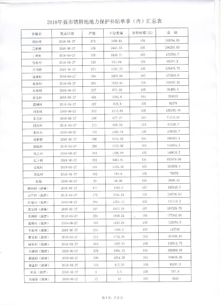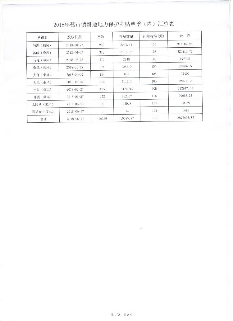 2018年聂市镇耕地地力保护补贴单季(内)汇总表