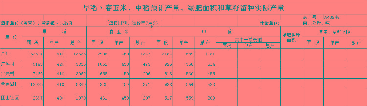 2019年黄盖镇早稻、春玉米、中稻、实际产量