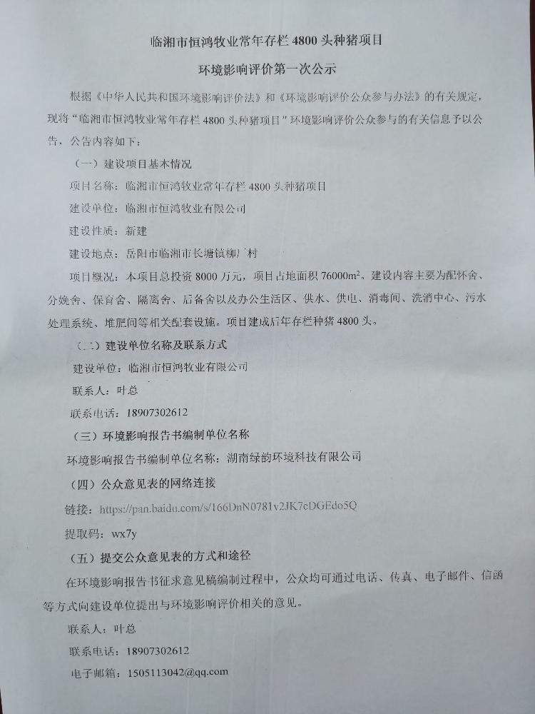 恒鸿牧业常年存栏4800头种猪项目环境影响评价第一次公示