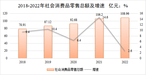 全年全市实现社会消费品零售总额108.96亿元,比上年增长2.6%。按经营地分,城镇消费品零售总额96.12亿元,增长2.59%;乡村消费品零售总额12.83亿元,增长2.59%。
