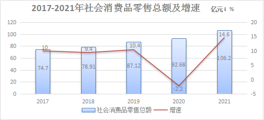 全年全市实现社会消费品零售总额106.2亿元,比上年增长14.6%。按经营地分,城镇消费品零售总额91.5亿元,增长15.1%;乡村消费品零售总额14.7亿元,增长11.3%。