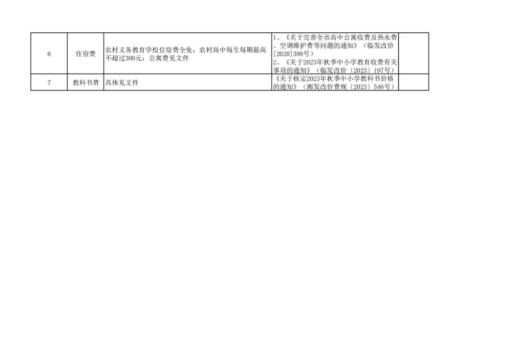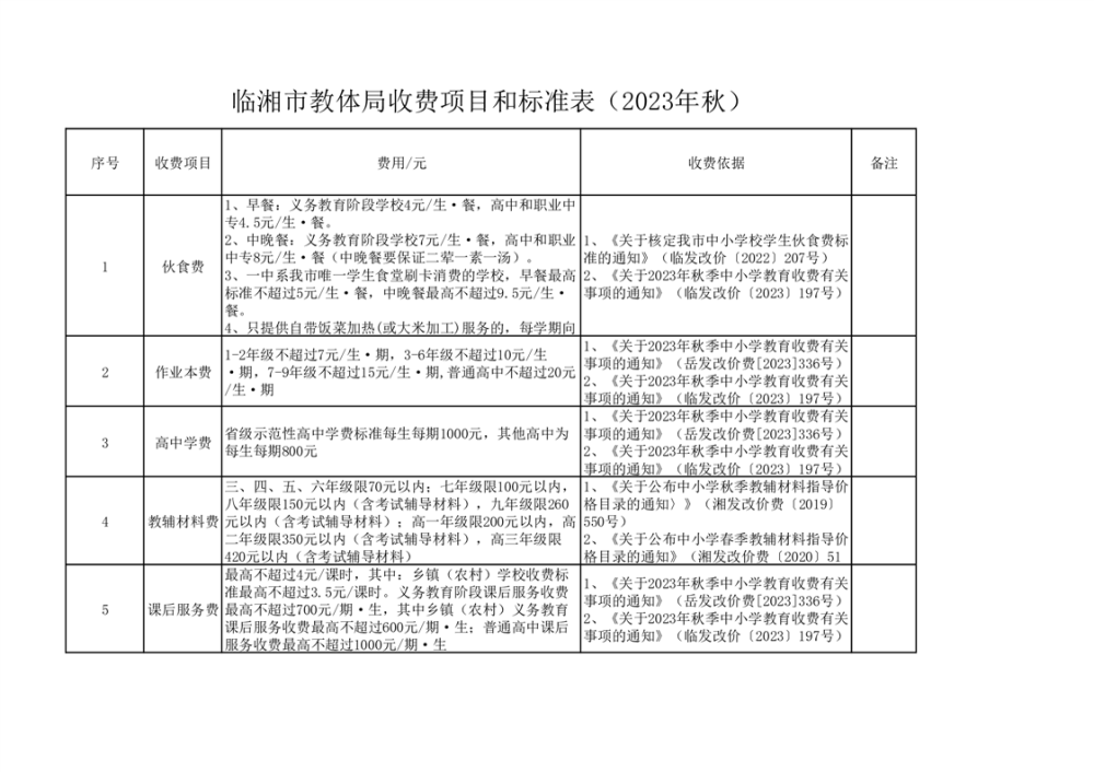 临湘市教体局收费项目和标准表(2023年秋)