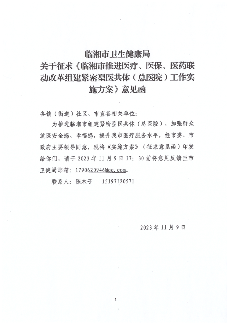 临湘市卫生健康局关于征求《临湘市推进医疗、医保、医药联动改革组紧密型医共体(总医院)工作实施方案》意见函