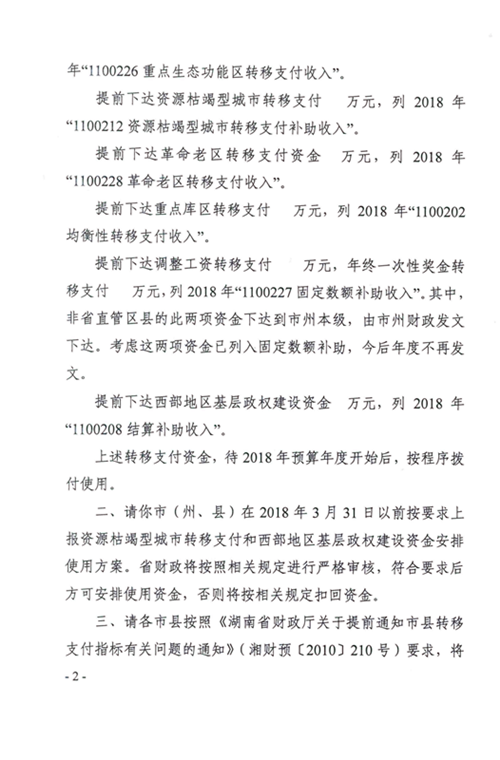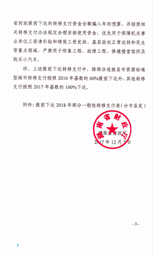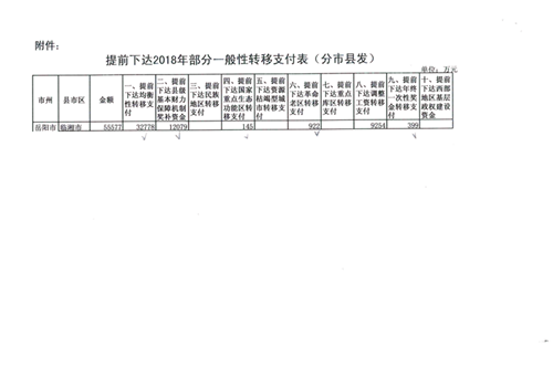 湖南省财政厅关于提前下达2018年部分一般性转移支付资金的通知