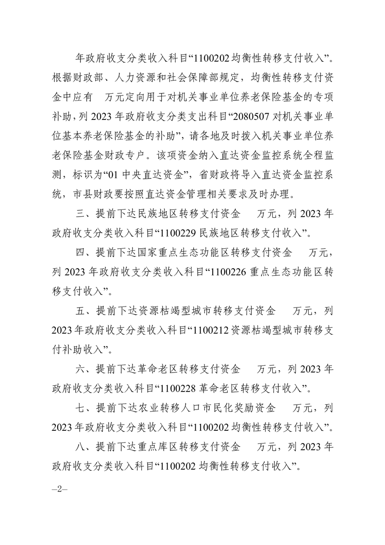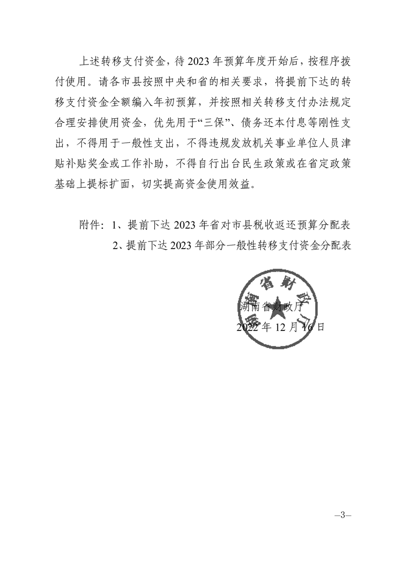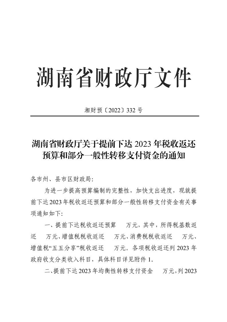 湖南省财政厅关于提前下达2023年税收返还预算和部分一般性转移支付资金的通知
