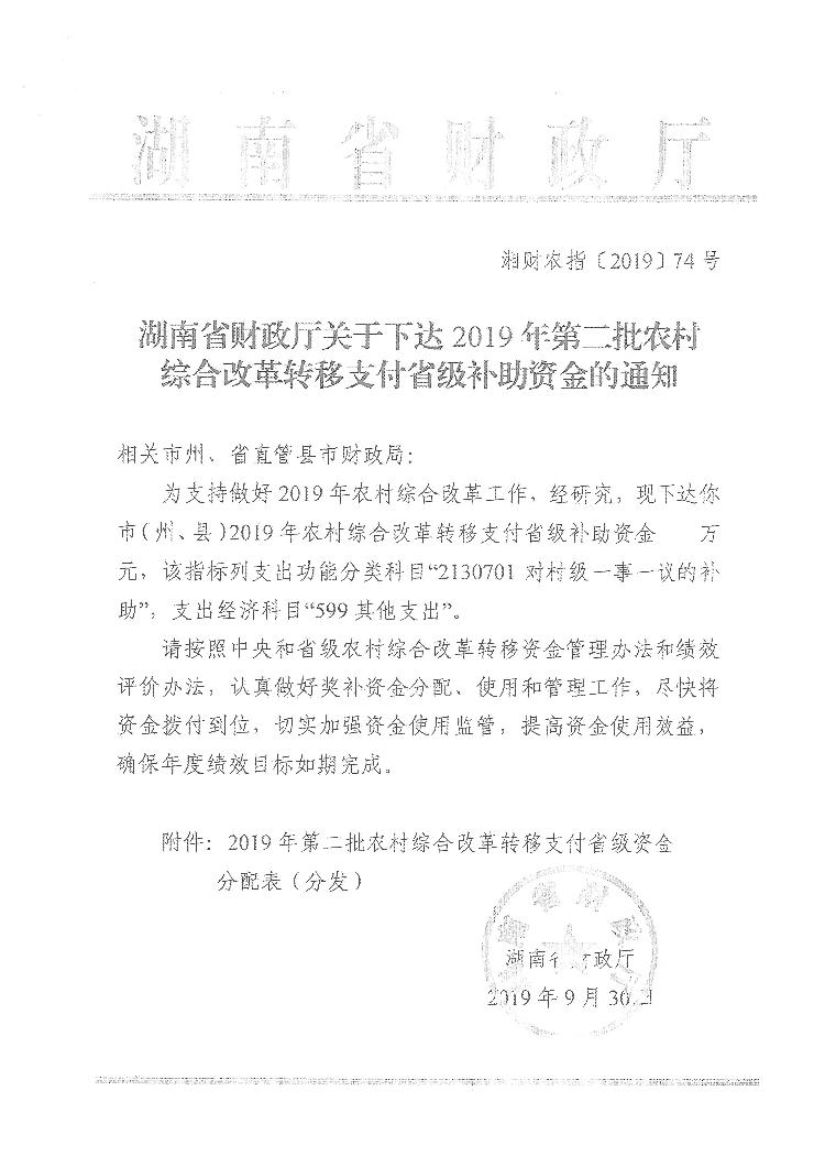 湖南省财政厅关于下达2019年第二批农村综合改革转移支付省级补助资金的通知