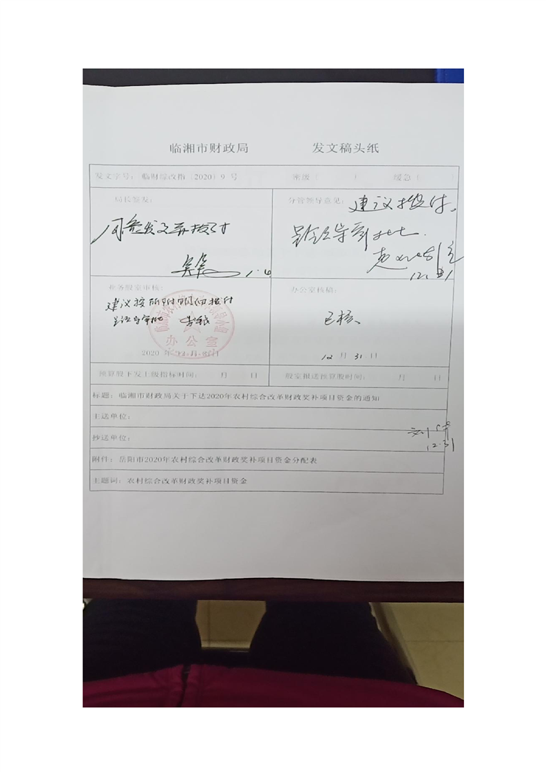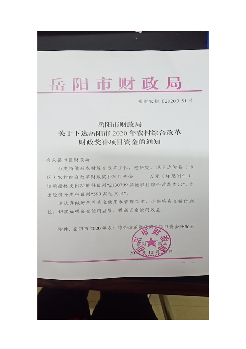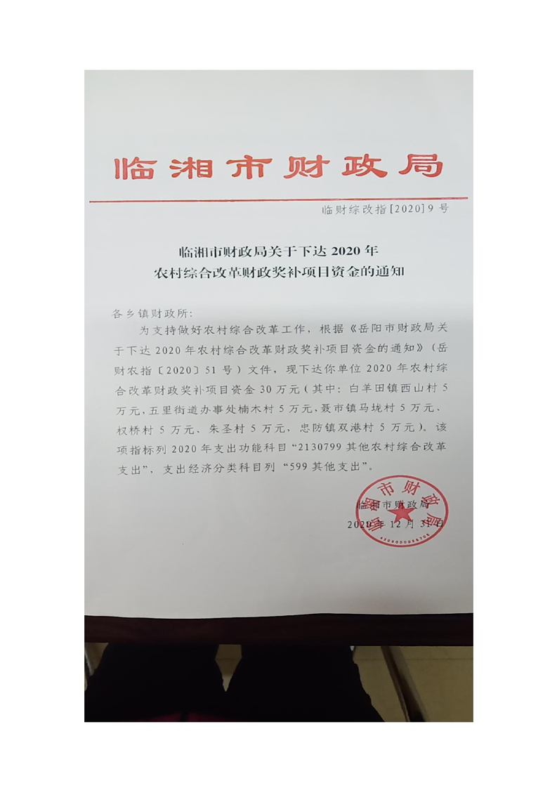 关于下达2020年农村综合改革财政奖补项目资金的通知