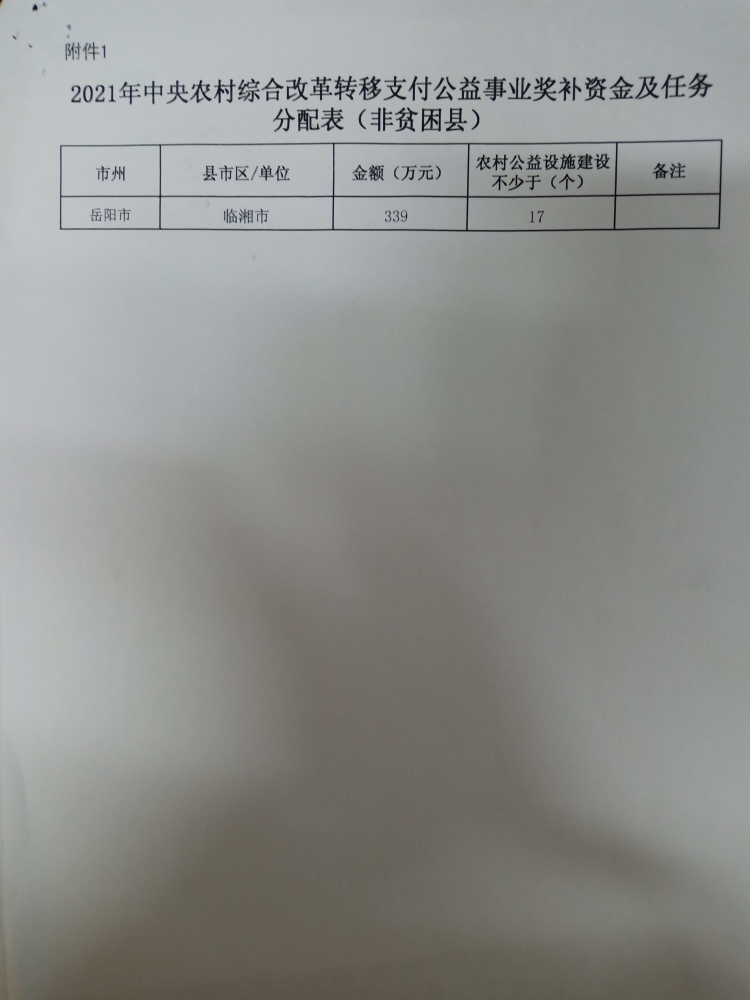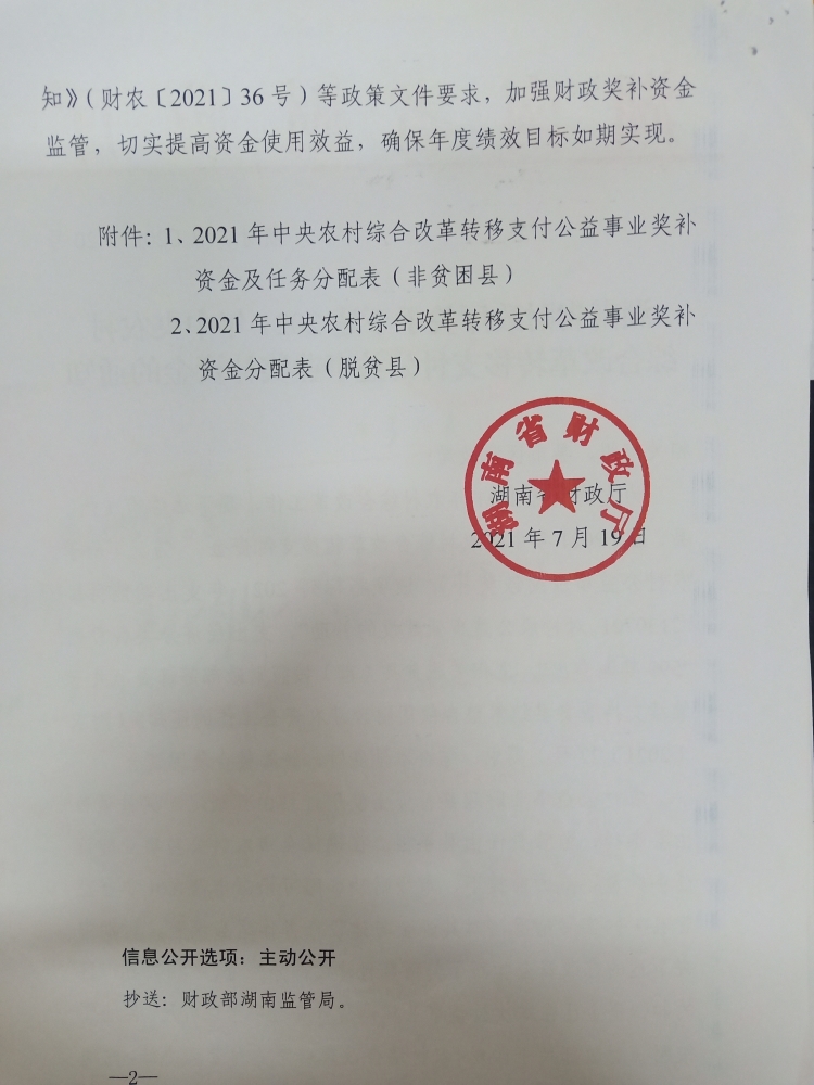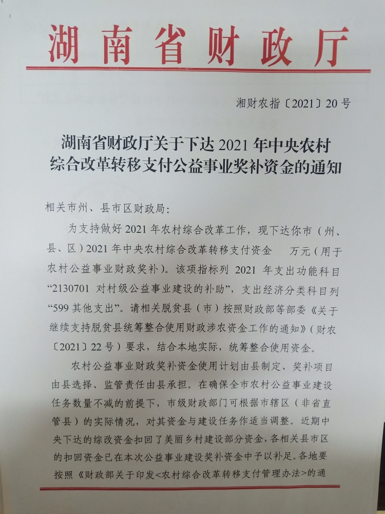 湖南省财政厅关于下达2021年中央农村综合改革转移支付公益事业奖补资金的通知