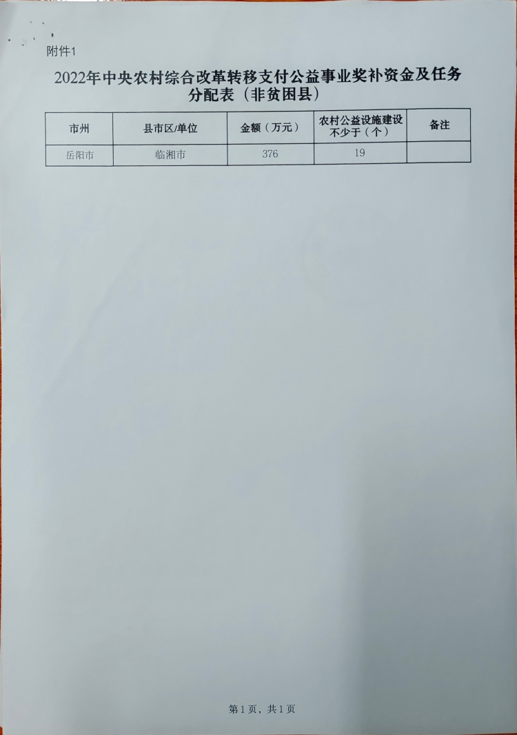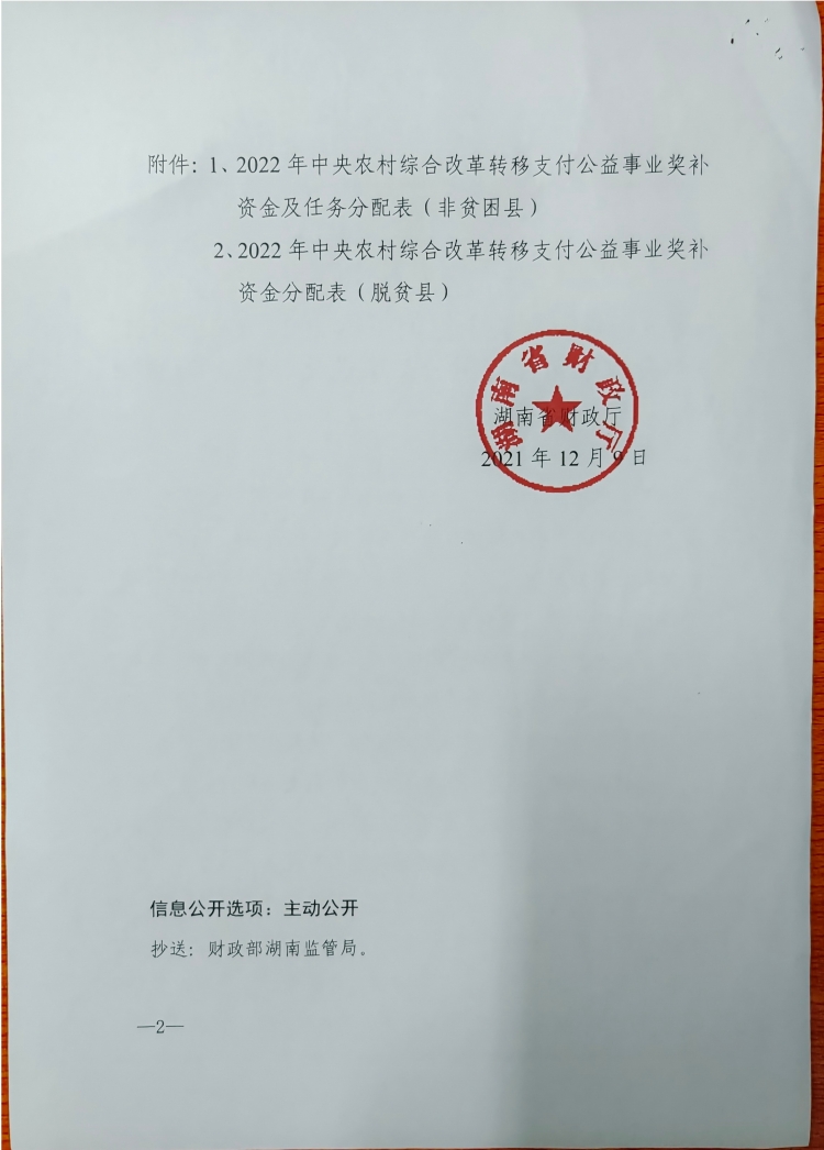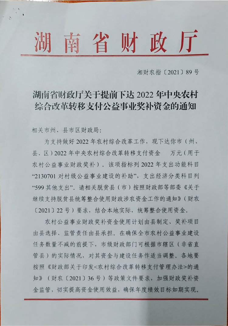 湖南省财政厅关于提前下达2022年中央农村综合改革转移支付公益事业奖补资金的通知