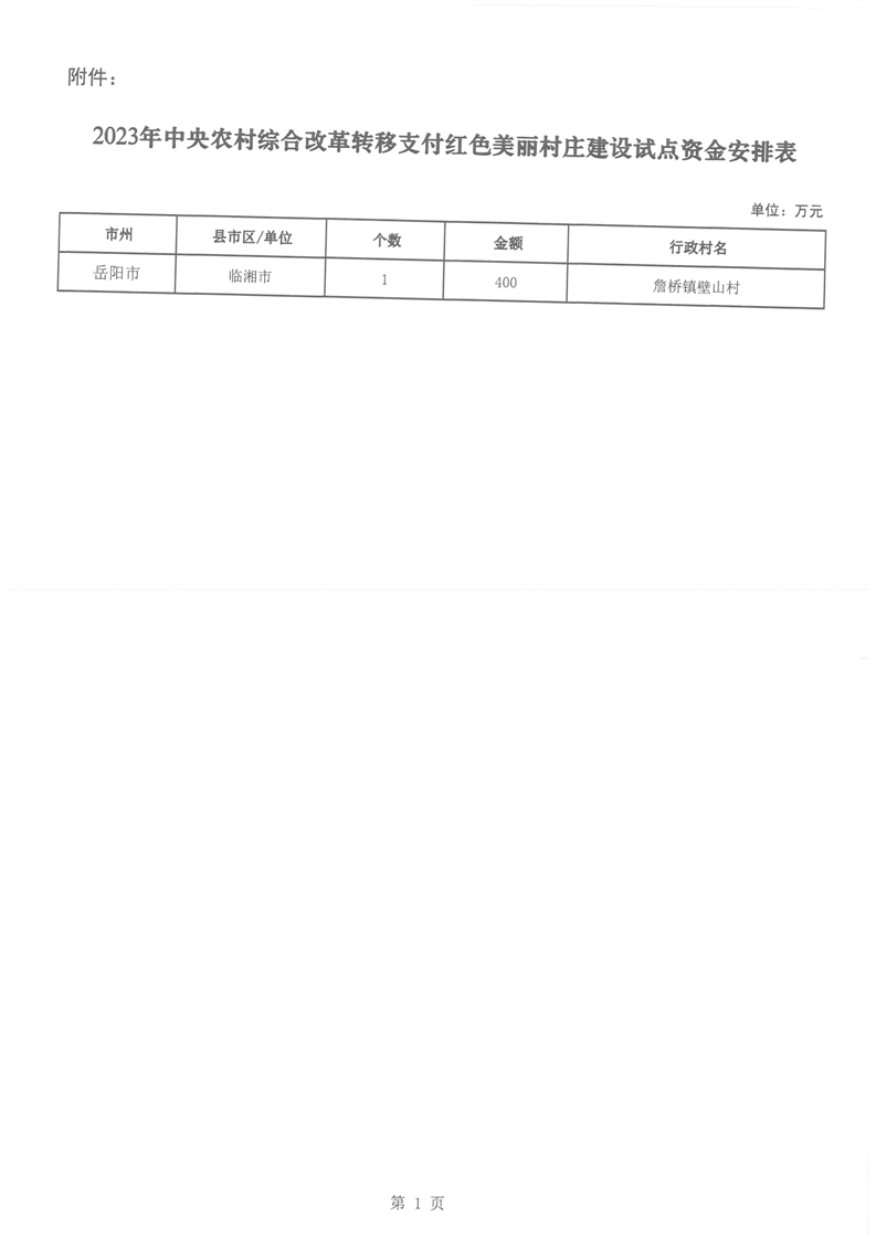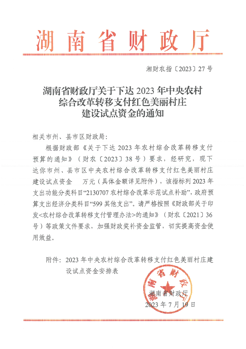 湖南省财政厅关于下达2023年中央农村综合改革转移支付红色美丽村庄建设试点资金的通知