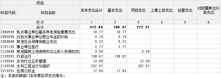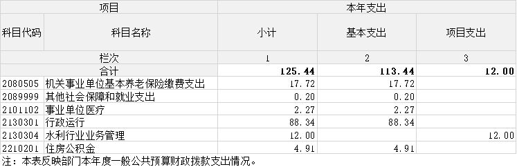 2024年度财政拨款支出128.44万元,主要用于以下方面:社会保障和就业(类)支出17.72万元,占13.79%。住房保障(类)支出4.91万元,占3.83%;农林水(类)行政运行支出88.34万元,占68.77%;卫生健康(类)支出2.27万元,占1.77%;其他社会保障和就业支出0.2万元,占0.15%;其他国有土地使用权出让收入安排的支出3万元,占2.34%;其他水利行业业务管理支出12万元,占9.35%。